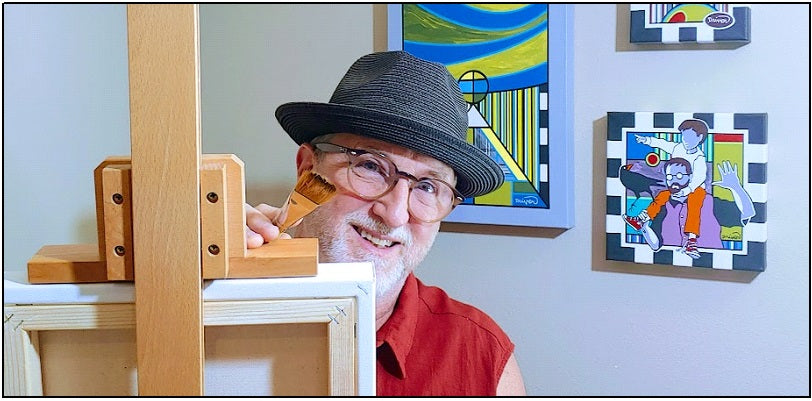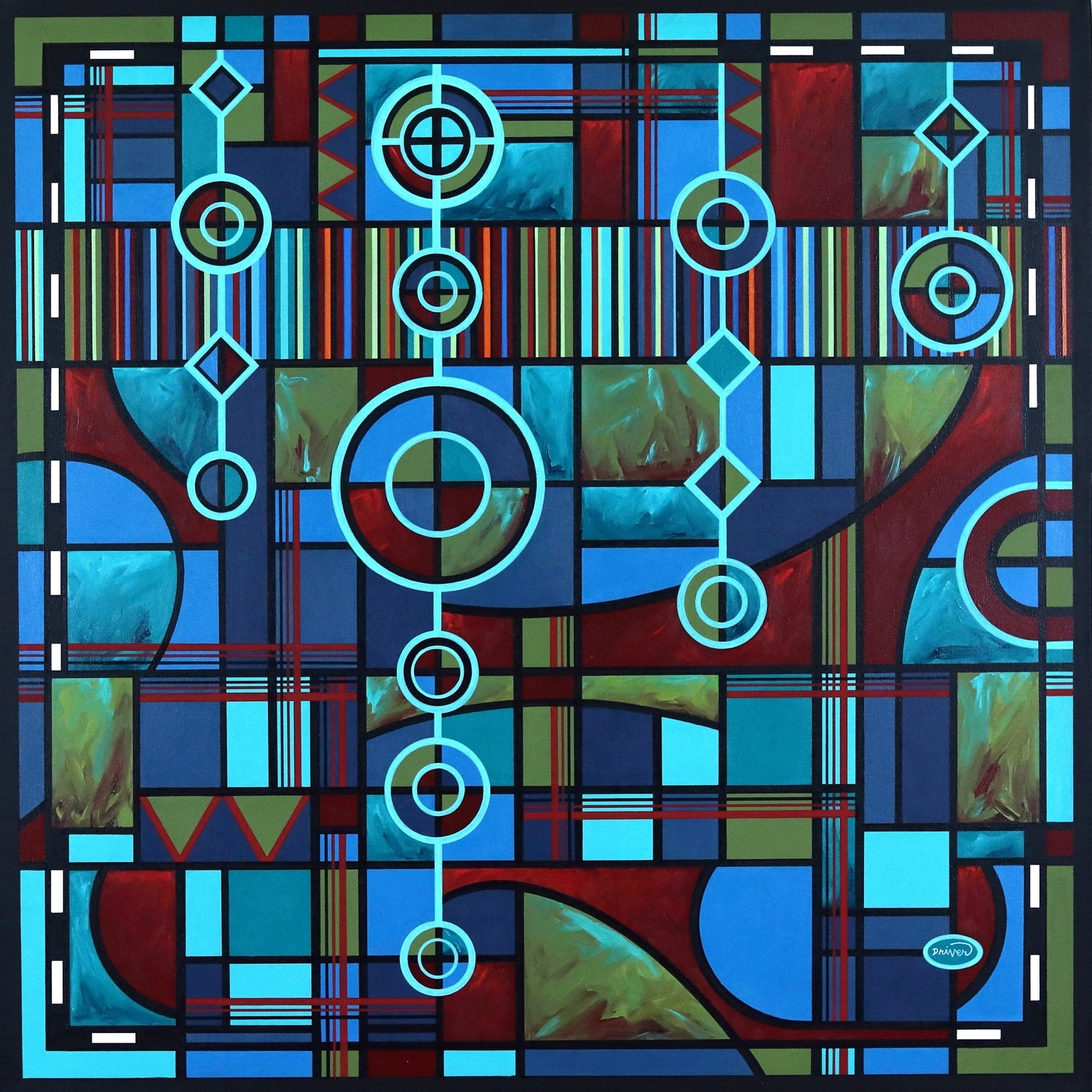 From the studio, Denny creates paintings in acrylics on stretched, gallery wrap canvas. Applying paint with brush, he renders large and basic shapes. With acrylic paint pens of various hues and tip sizes, straight edges (T-Squares, Triangles, and Rulers), shape templates of circles, triangles, and ellipses (often using plates and bowls, etc. for larger shapes) he implements fine detail lines. Denny often uses upholstery tacks (he calls rivets) on the canvas edges for an industrial look. Each piece is wired on the back, labeled, and ready to hang.