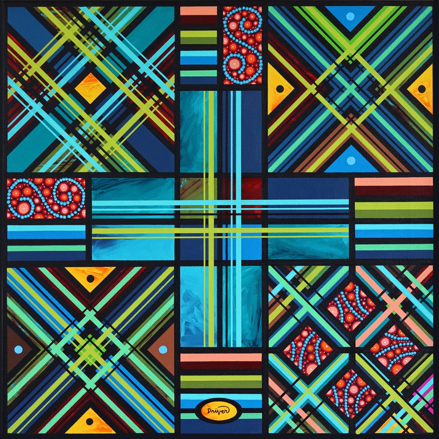 From the studio, Denny creates paintings in acrylics on stretched, gallery wrap canvas. Applying paint with brush, he renders large and basic shapes. With acrylic paint pens of various hues and tip sizes, straight edges (T-Squares, Triangles, and Rulers), shape templates of circles, triangles, and ellipses (often using plates and bowls, etc. for larger shapes) he implements fine detail lines. Denny often uses upholstery tacks (he calls rivets) on the canvas edges for an industrial look. Each piece is wired on the back, labeled, and ready to hang.