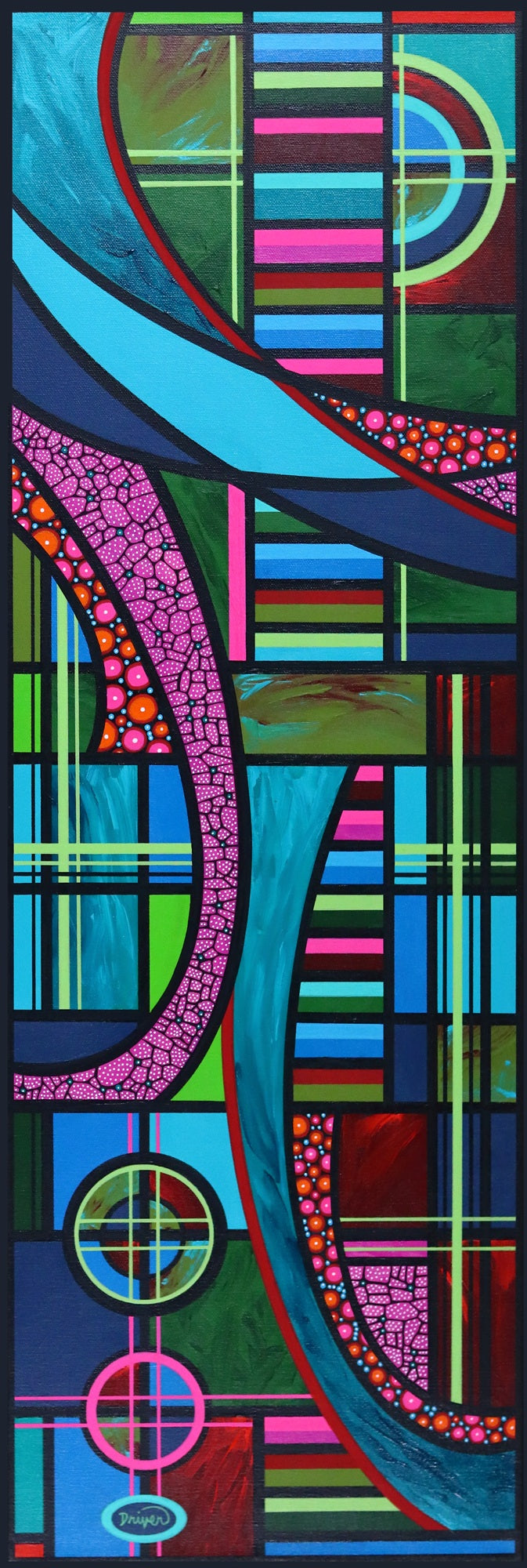 As I started working this tall, elongated piece, I painted swooshed lines of color throughout, and I played around with adding additional semi-circles and curved lines. Soon, I began seeing arm-like tentacles in the composition. I then started thinking about title ideas. I liked the notion of an abstract, geometric squid, and set out to find another “Squ” word to complete an alliterated title. I was intrigued with how squalene worked with squid. I was equally happy when I found out squalene was shark liver oil. Two marine animals, a perfect pairing. And now this squid inspired painting reminds me of a story.
