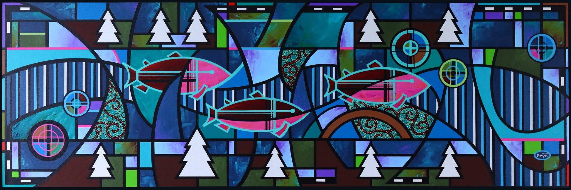 This artwork I’ve created was inspired by the beautiful life and tragic loss of a childhood friend. The contrasting flowing and fractured lines depict the unforgiving icy river and symbolize that odd little laugh of his. The juxtaposed warm and cool color palette was chosen to evoke the feeling of life and loss in a tragic tale of friendship and farewell.